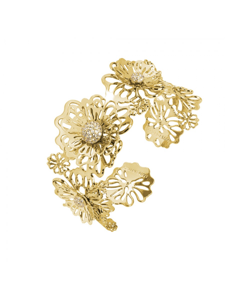 Bracciale rigido a fascia placcato oro giallo (diametro cm 6) con decoro composto da rose selvatiche tridimensionali e nucleo centrale di zirconi.