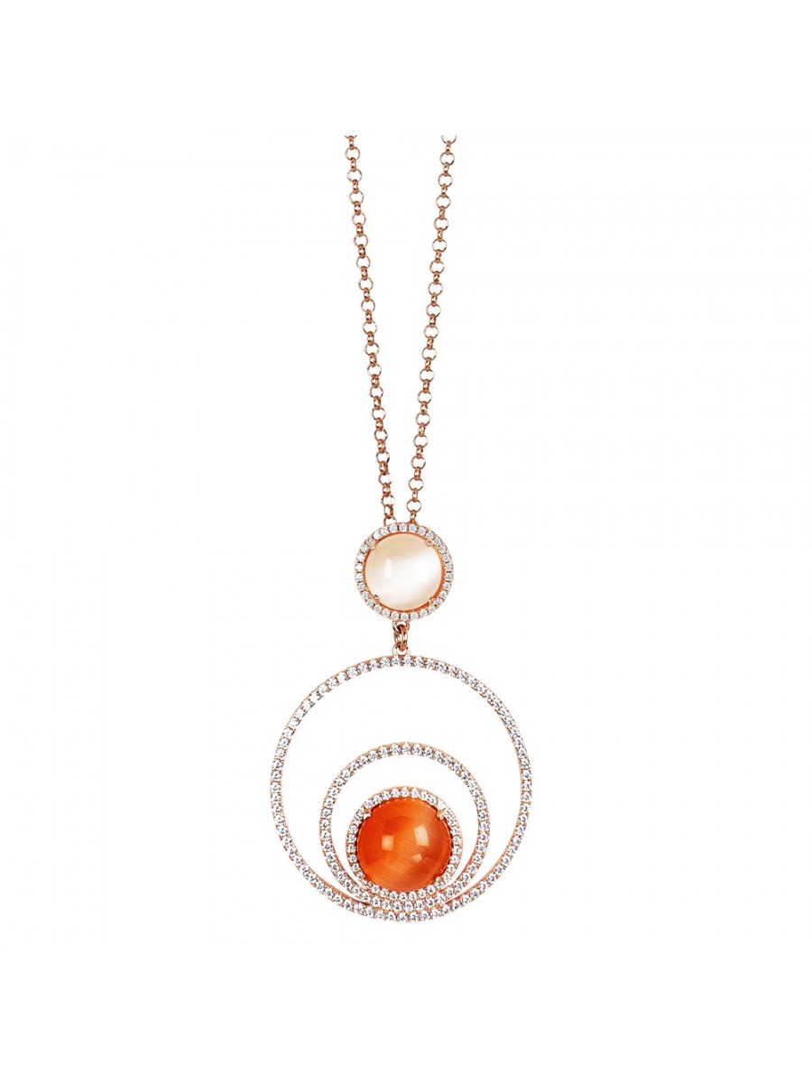 Collana lunga in bronzo placcato oro rosa con pendente (lunghezza cm 5) composto da cristallo cabochon beige, tre cerchi concentrici di zirconi (diametro massimo cm 3,5) e cristallo cabochon interno fucsia gatteggiante.